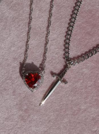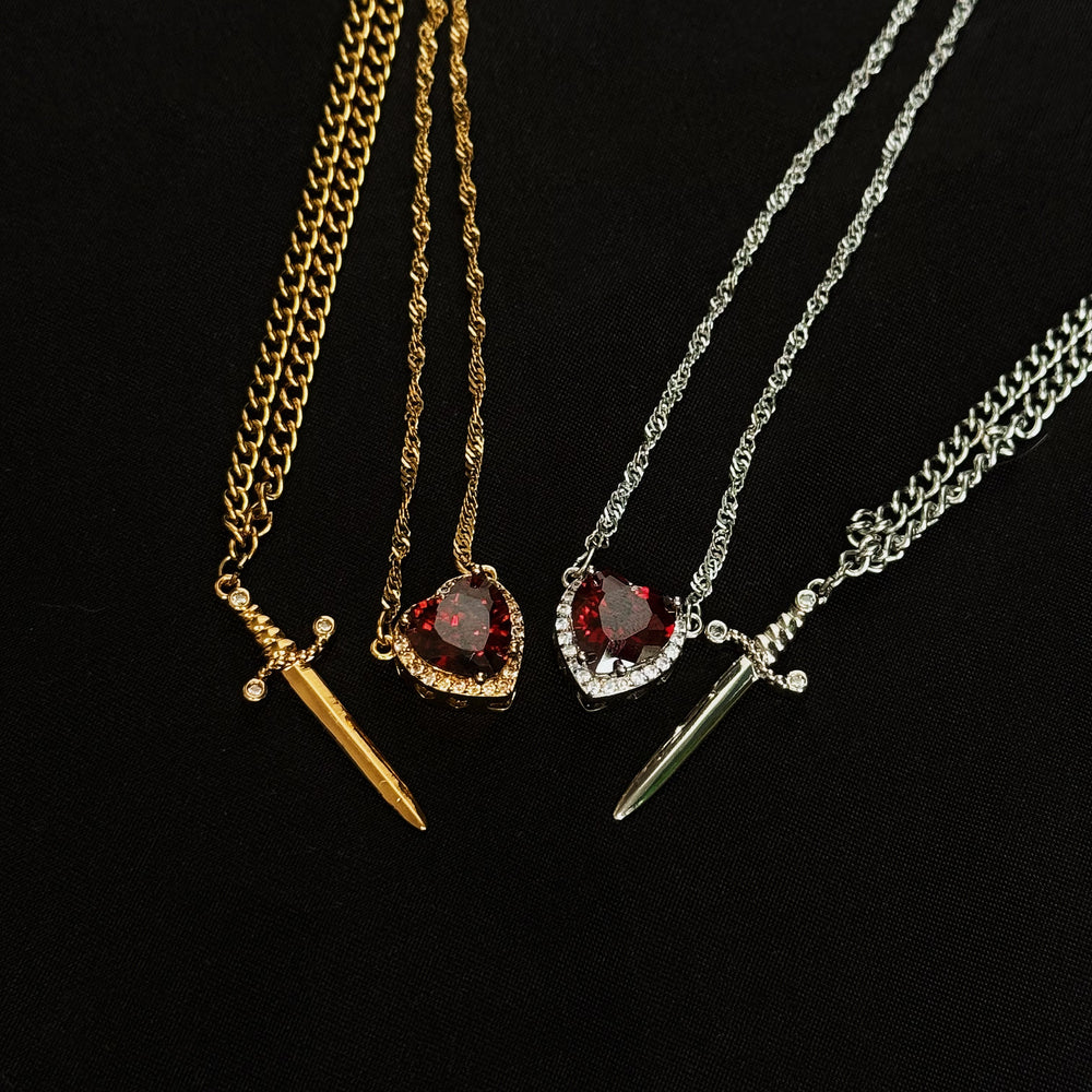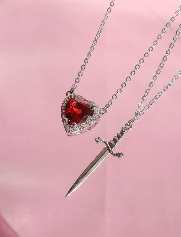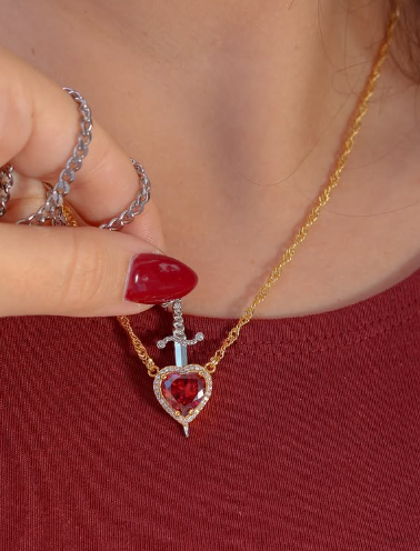 This unique design features a sword pendant that fits through the heart’s center, highlighted by a radiant crystal in pink or red.